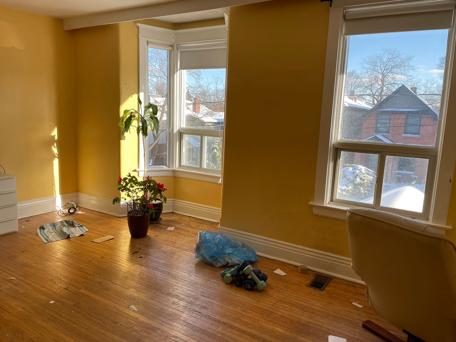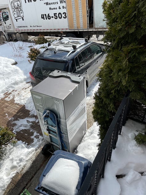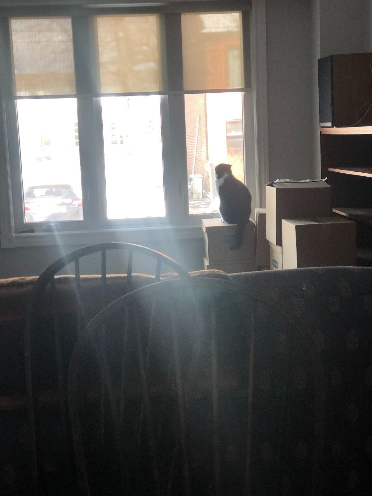 But we’re here in the house. And when we more or less decided that the couch will go in the middle of the room with its back to the dining room table rather than at the window looking back into the room - – shout out to Kaiva, whose idea this was - we sat on that couch, looked out the window, and it was like we finally landed. The view wasn’t much to speak of, it was just a nice place to sit. And though we were surrounded by boxes and chaos, we could see that our old things were looking better than ever against the gray blandness of the walls and floor. The couch looked better than I’ve ever seen it look. The two dark brown bookcases, which had never looked that good in the old place, somehow looked at home here.